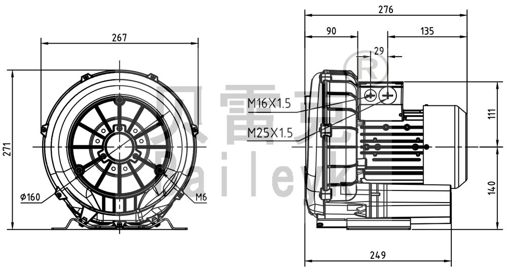 最大風量:140m3/h 最大正壓:60mbar 最大負壓:60mbar 防護等級:IP55 噪音:56db 重量:12Kg